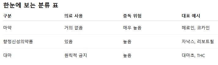홈 한마지식 마약정보 청소년예방 대표적 마약류 종류와 위험성 작성자 한국마약신문 등록 2025년 10월 13일 마약 : 양귀비, 아편, 코카인, 헤로인, 모르핀, 펜타닐 등 향정신성의약품 : 필로폰(메트암페타민), 엑스터시(MDMA), 졸피뎀, GHB(일명 물뽕) 등 대마 : 대마초 및 그 수지, 이를 함유한 제품 임시마약류 : 구조나 작용이 기존 마약과 유사해 선제적으로 규제하는 신종 약물 작성자 한국마약신문 뒤로가기